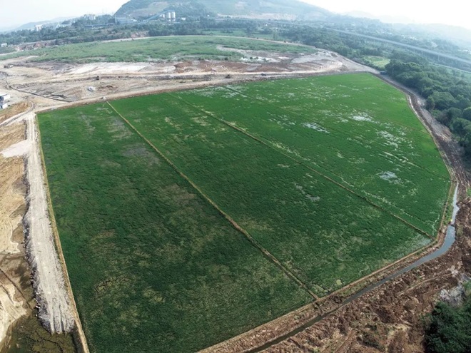 秉承綠色發展的理念,南山礦創新治理模式,利用和尚橋采場多余的廢土進行回填、土壤改良、凹山人工湖循環利用等,修復廢棄礦坑,喚醒沉睡土地,消除地質災害隱患,先期完成60畝水稻田治理。今年7月5日,南山礦采用無人機開始播撒稻種。