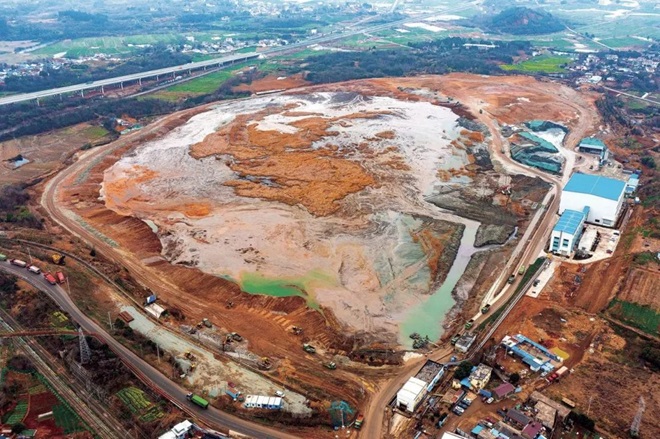 2024年3月17日,經過地質環境治理尾砂入坑回填工程的東山礦坑航拍場景。