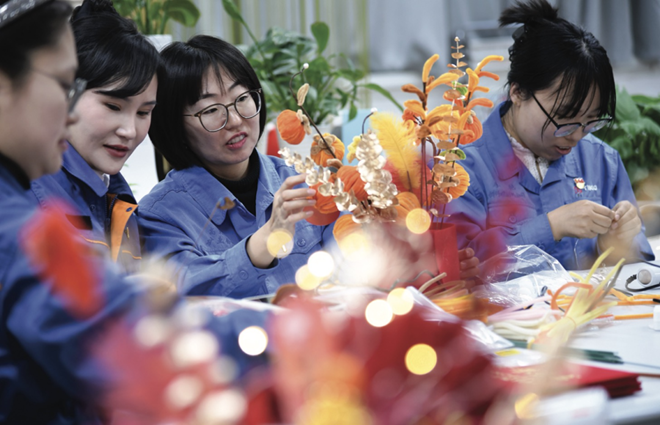 1月13日,中國(guó)寶武太鋼集團(tuán)女職工在手工制作年宵花(如圖)。當(dāng)天,太鋼工會(huì)組織開(kāi)展了“巧手迎新春匠心蘊(yùn)風(fēng)采”活動(dòng)。女職工們會(huì)聚一堂,展現(xiàn)“巧”功夫,以自制作品喜迎乙巳蛇年春節(jié)的到來(lái)。(本報(bào)記者 王旭宏 攝)