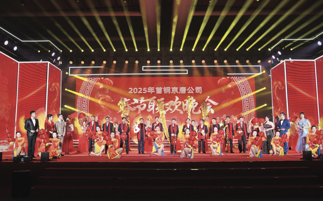 祥龍辭歲福滿(mǎn)鋼城,金蛇起舞夢(mèng)想啟程。1 月23日晚,首鋼京唐公司在廠(chǎng)前體育館內(nèi),舉辦2025年春節(jié)聯(lián)歡晚會(huì)。首鋼京唐、各協(xié)力單位的職工家屬歡聚一堂,載歌載舞,共迎新春。圖為首鋼京唐領(lǐng)導(dǎo)上臺(tái)致新春賀詞。(楊立文 攝)