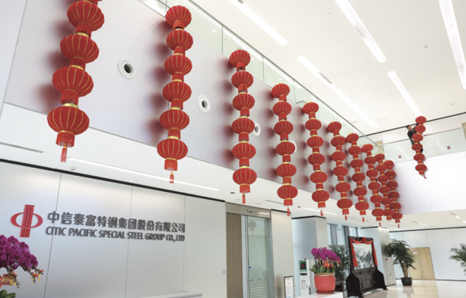 1月23日,中信泰富特鋼集團(tuán)科技大樓,工作人員(右上)正在大廳懸掛喜慶的大紅燈籠,迎接蛇年春節(jié)。(特約通訊員 陸衛(wèi)宇 攝)