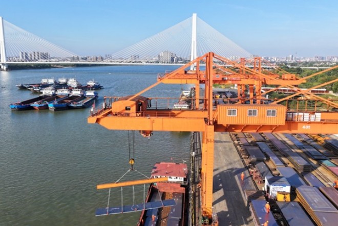 圖為湘鋼順祥碼頭正在發運貨物。(賀意波 攝)