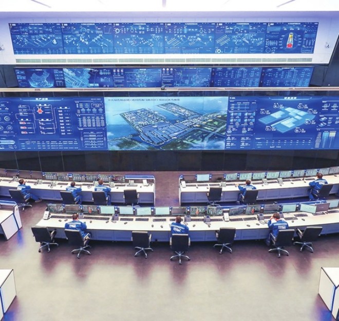 走進該公司的智慧控制中心,“智能化”一詞得到了更加具象的表現。長達數米的“智慧大屏”上,從原料車輛進廠到產成品質檢入庫再出庫,所有生產中的相關數據一目了然。小到一個卷產品的質量瑕疵,大到整個廠區的顆粒物排放水平,全面監管到位。