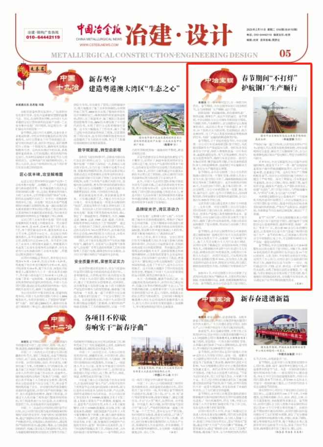 春節(jié)期間,由中冶寶鋼第二分公司負(fù)責(zé)的梅鋼五燒結(jié)區(qū)域一片繁忙景象:檢修人員舍小家為大家,堅守崗位不停工,確保梅鋼煉鐵區(qū)域的系列年修工作順利進(jìn)行。此次年修預(yù)計持續(xù)45天,共包括233個項目,重點(diǎn)難點(diǎn)項目多。中冶寶鋼第二分公司年修團(tuán)隊統(tǒng)一部署、精心策劃,每日定點(diǎn)、定時、定員召開調(diào)度會議,高效調(diào)配資源,持續(xù)加強(qiáng)安全管理和質(zhì)量控制,全力以赴打好2025年開局之戰(zhàn)。