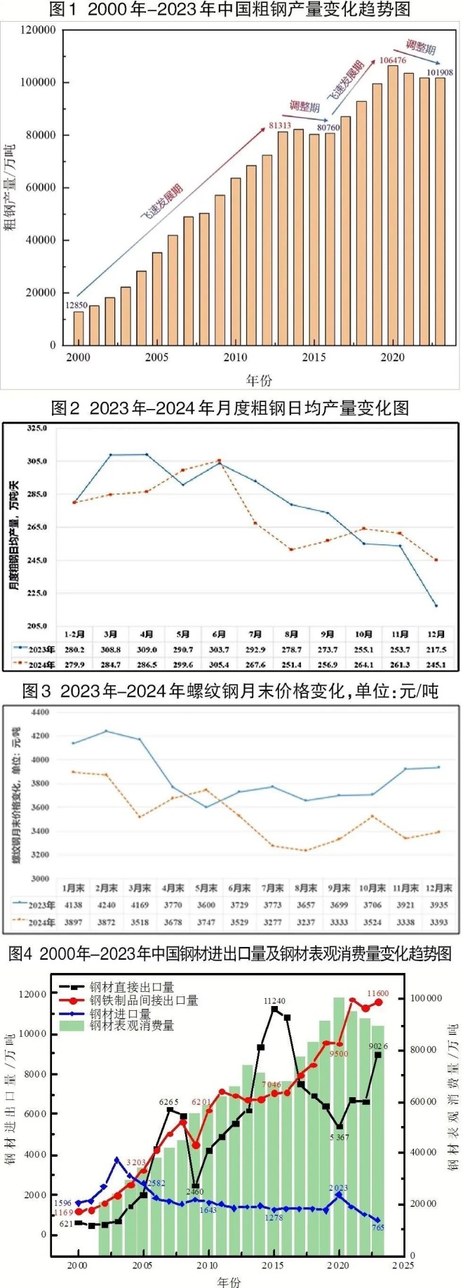 綜合分析新世紀以來我國鋼鐵行業粗鋼年產量、近兩年粗鋼月度日均產量、月末螺紋鋼價格以及鋼材直接出口量、鋼鐵制品間接出口量等數據的變化(圖1~圖4),初步判斷目前我國粗鋼產量總體呈現供大于求的態勢,我國鋼鐵行業已經進入減量化波動下行階段,但這個波動下行的周期與幅度還有待進一步觀察,下文將對未來我國粗鋼產量的變化趨勢進行預測和探討。