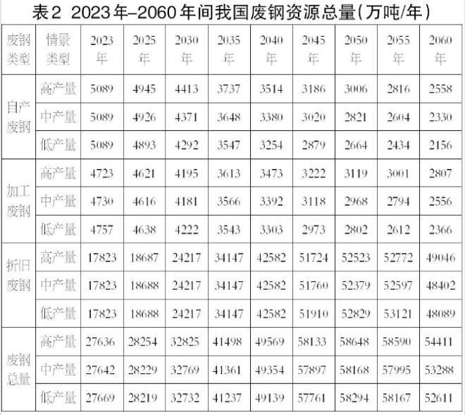 這三類鋼鐵制造流程的交替演變過程將與未來我國廢鋼資源量的產出與流向密切相關。目前,廢鋼可以分為鋼廠自產廢鋼、下游產業加工廢鋼和社會折舊廢鋼3大類,基于表1中未來我國粗鋼產量的預測結果,針對不同的廢鋼類型分別采用折算系數法和鋼鐵產品生命周期法,構建廢鋼資源量預測模型,對2023年—2060年我國各類廢鋼資源量進行科學測算(測算結果如下表2所示)。