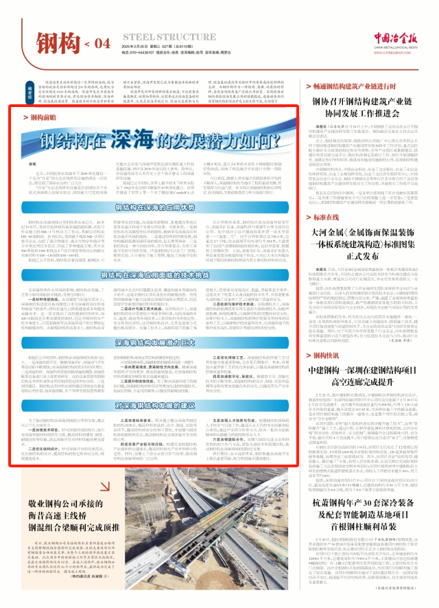 三是完善標準體系。同步建立健全深海用鋼結構的標準體系,規范材料的選擇、設計、制造、安裝等各環節,提高材料的安全性和可靠性,并加強與國際標準的接軌和互認,推動鋼結構在全球深海開發市場的應用。