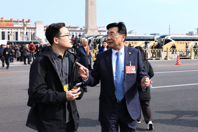 圖為全國政協委員,中鋁集團黨組書記、董事長段向東在開幕會后與中國冶金報社兩會報道組記者交流