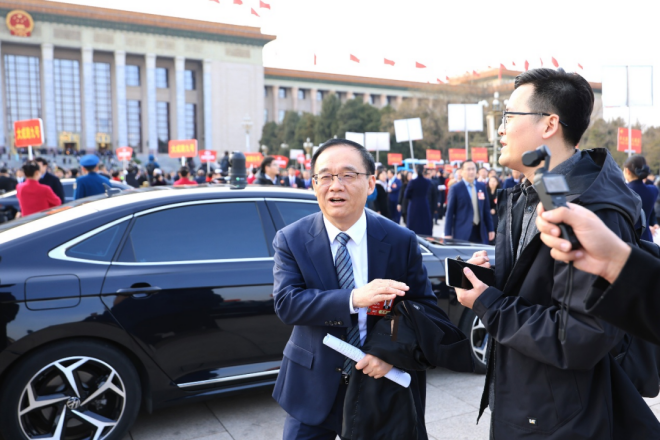 圖為全國政協委員,中國寶武黨委書記、董事長胡望明在步入會場前與中國冶金報社兩會報道組記者交流