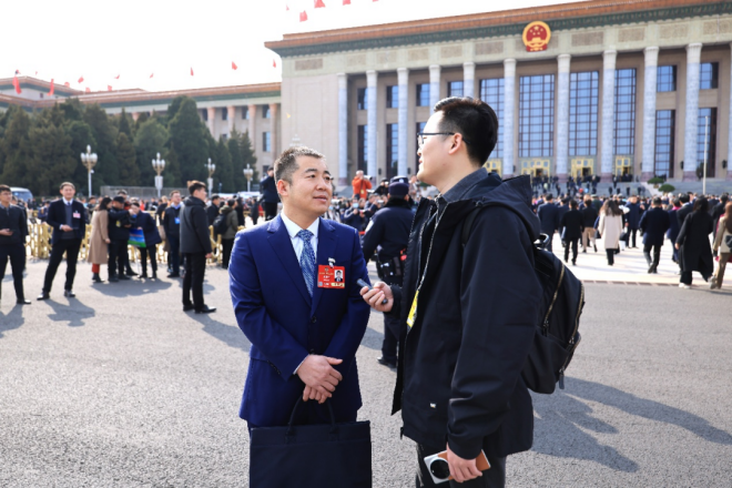 圖為全國政協委員,包頭稀土研究院副主任研究員李寶犬在步入會場前與中國冶金報社兩會報道組記者交流