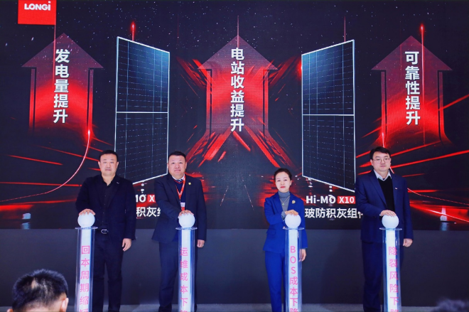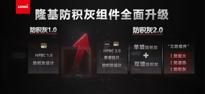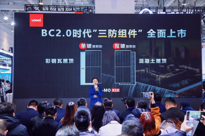 3月5日,隆基綠能在第二十屆中國(濟南)國際太陽能利用大會暨第四屆中國(山東)新能源與儲能應用博覽會上發布基于HPBC2.0技術的防積灰組件——Hi-MO X10防積灰組件,最高功率可達670W,轉化效率高達24.8%,疊加隆基在行業內首創的防積灰技術,單位面積理論發電量較常規TOPCon組件高出10%以上。