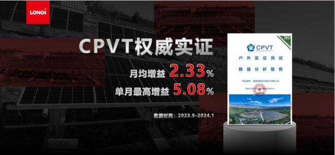 國家光伏質檢中心(CPVT)作為我國首個國家級光伏產品法定檢驗機構,在位于銀川的戶外實證基地對隆基防積灰組件的發電性能和衰減進行了實測。通過7個月(2023年9月至2024年3月)的實測數據得知,隆基BC防積灰組件較常規BC組件月均相對增益2.33%,最高月相對增益5.08%,最高單日增益達10%以上。