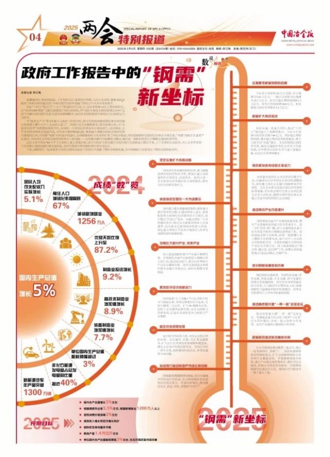 這份文本終將在960萬平方公里的土地上落地生根,成為無數奮斗者在通往中國式現代化的路途上繼往開來、上下求索的生動故事,并讓全世界看到一個經濟體以制度創新打破發展桎梏,在時代激蕩中保持韌性增長的中國范式。下面,請跟我們一起來看看今年的全國兩會政府工作報告中透露了哪些發展新機遇,為中國鋼鐵行業謀劃好了哪些發展的新坐標。