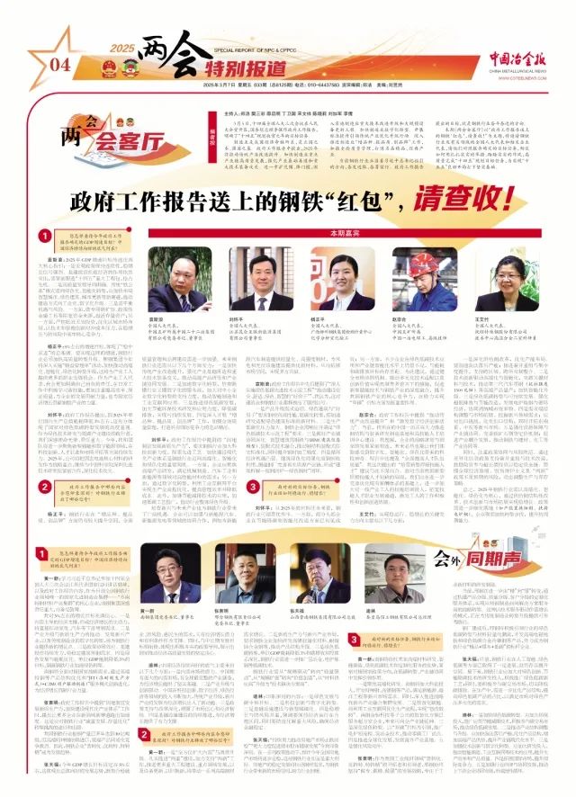 本期《兩會會客廳》以“政府工作報告送上的鋼鐵‘紅包’,請查收!”為主題,特邀請鋼鐵行業及有關領域的全國人大代表和相關企業代表,請他們對照報告確定的目標任務,暢談如何用扎扎實實的舉措、踏踏實實的作風,高質量完成“十四五”規劃目標任務,為實現“十五五”良好開局打下堅實基礎。
