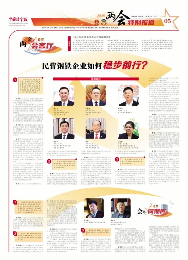 當(dāng)前,民營企業(yè)在發(fā)展進(jìn)程中雖面臨一些困難與挑戰(zhàn),但同時(shí)也擁有諸多新優(yōu)勢與新機(jī)遇。如何看待當(dāng)前民營鋼鐵企業(yè)發(fā)展形勢?民營鋼鐵企業(yè)如何穩(wěn)步前行?針對這些問題,本期《兩會(huì)會(huì)客廳》以“民營鋼鐵企業(yè)如何穩(wěn)步前行”為主題,邀請民營鋼鐵企業(yè)及有關(guān)領(lǐng)域的全國人大代表和相關(guān)企業(yè)代表,請他們分享對當(dāng)前民營鋼鐵企業(yè)發(fā)展形勢的見解,以及針對企業(yè)如何穩(wěn)步前行提出建設(shè)性思路與策略,共同為民營鋼鐵企業(yè)高質(zhì)量發(fā)展出謀劃策。