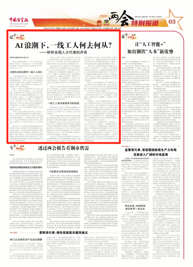 AI(人工智能)浪潮下,一線工人崗位是否有被取代的風(fēng)險?應(yīng)當(dāng)如何應(yīng)對?針對這些問題,兩會期間,中國冶金報社兩會報道組記者采訪了多位全國人大代表。