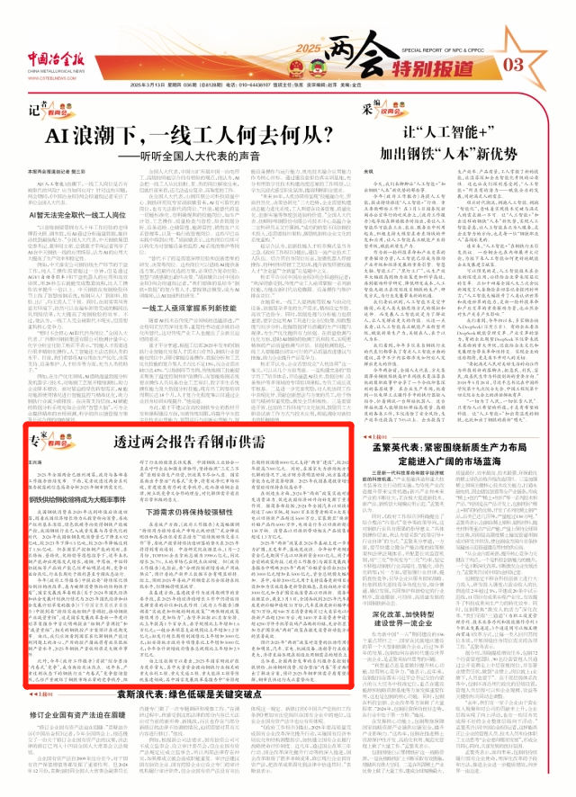 總體看,全國兩會發(fā)布的系列報告在控制鋼鐵供給、拉動鋼材消費、綜合整治“內(nèi)卷”等方面給出了解決方案,預(yù)計2025年鋼市供需矛盾有望緩解,鋼市良性運行或正蓄勢而發(fā)。(王興濤)