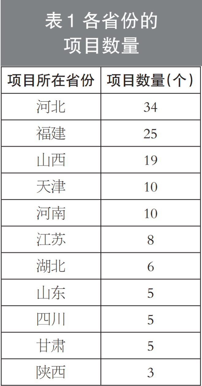 從項目數(shù)量來看,河北位居榜首,共涉及34個項目;福建緊跟其后,有25個項目;山西位列第三,共有19個項目;其他省份項目數(shù)量分別為天津和河南各10個,江蘇8個,湖北6個,山東、四川和甘肅各5個,陜西3個。