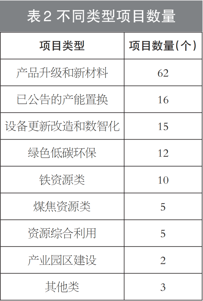 在項目類型方面,產(chǎn)品升級改造與新材料項目最多,高達62個,接近總項目數(shù)量的一半;涉及已完成產(chǎn)能置換公告的續(xù)建或新建項目有16個,排在項目類別數(shù)量的第二位;設(shè)備更新改造和數(shù)智化項目建設(shè)共15個;綠色低碳環(huán)保項目數(shù)量為12個。此外,還涵蓋鐵資源項目、煤焦資源項目、資源綜合利用項目等。