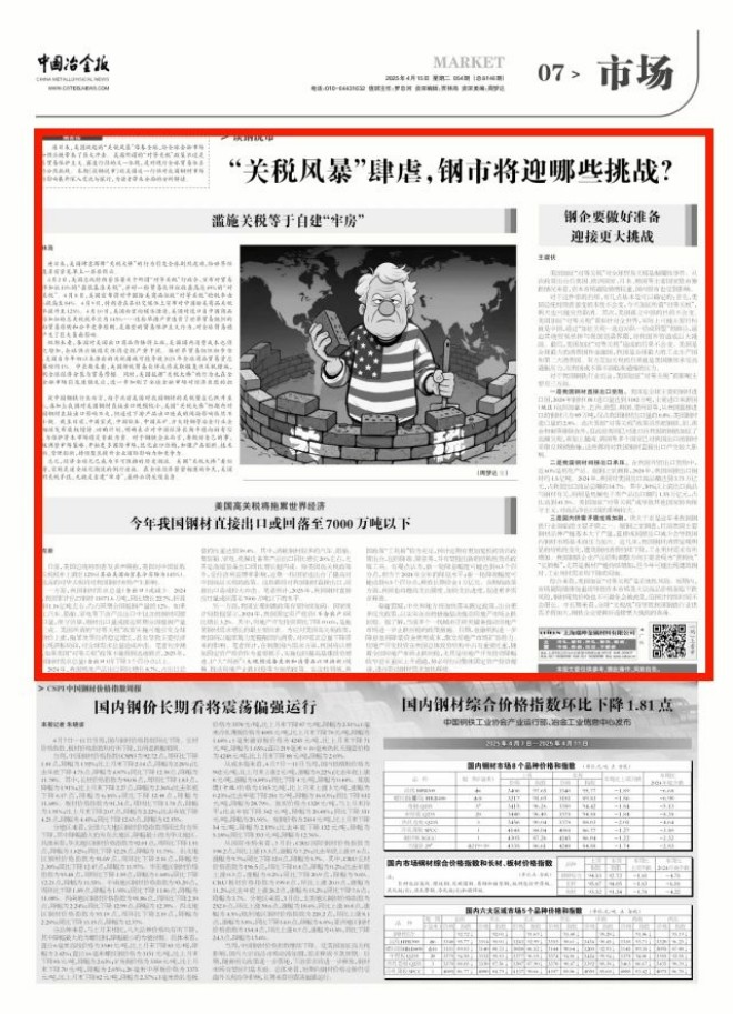 綜合來看,美國加征“對等關稅”是系統性風險。短期內,市場避險情緒加重將導致資本市場及大宗商品價格面臨下跌風險,鋼材現貨價格也不可避免會被波及,但預計持續時間不會很長。中長期來看,全球“關稅戰”將導致我國鋼鐵行業供需矛盾加大,鋼鐵企業要做好迎接更大挑戰的準備。