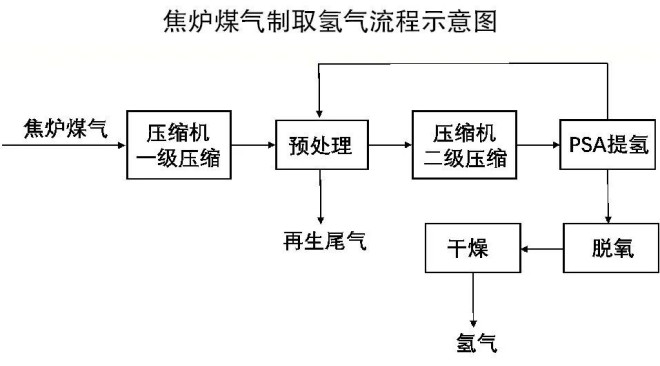 目前,工業化常用的焦爐煤氣制氫的方法為變壓吸附法(PSA),其核心原理為通過壓力周期性變化實現吸附劑對雜質的選擇性吸附與解吸,利用焦爐煤氣中氫氣與其他氣體組分在吸附劑上的動力學特性差異完成分離,最終獲得高純氫氣。該工藝無需化學反應,依賴物理吸附的可逆性,具有能耗低、操作溫度溫和(常溫)的優勢,具體流程如圖所示。