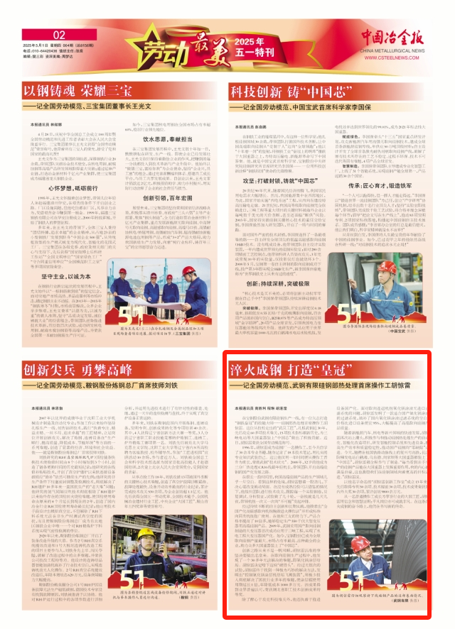 隨著新能源汽車、核電等新興領(lǐng)域的快速發(fā)展,胡驚雷再次站上潮頭,積極參與和推動(dòng)硅鋼熱處理生產(chǎn)的自動(dòng)化、智能化改造項(xiàng)目,研發(fā)智能控制系統(tǒng)和先進(jìn)設(shè)備,提高生產(chǎn)效率和質(zhì)量穩(wěn)定性,推動(dòng)國(guó)產(chǎn)硅鋼向“零缺陷”邁進(jìn)。今天,馳騁在祖國(guó)鐵路動(dòng)脈線上的復(fù)興號(hào)高鐵,長(zhǎng)江階梯發(fā)電站白鶴灘、烏東德、向家壩等大國(guó)重器都裝上了“中國(guó)芯”,胡驚雷都全程參與了制造。“每當(dāng)看到親手生產(chǎn)的硅鋼產(chǎn)品能在大國(guó)重器上發(fā)揮重要作用,我的內(nèi)心就滿是自豪,這也激勵(lì)我們?cè)诠桎擃I(lǐng)域向著更高的目標(biāo)邁進(jìn)。”胡驚雷說(shuō)。