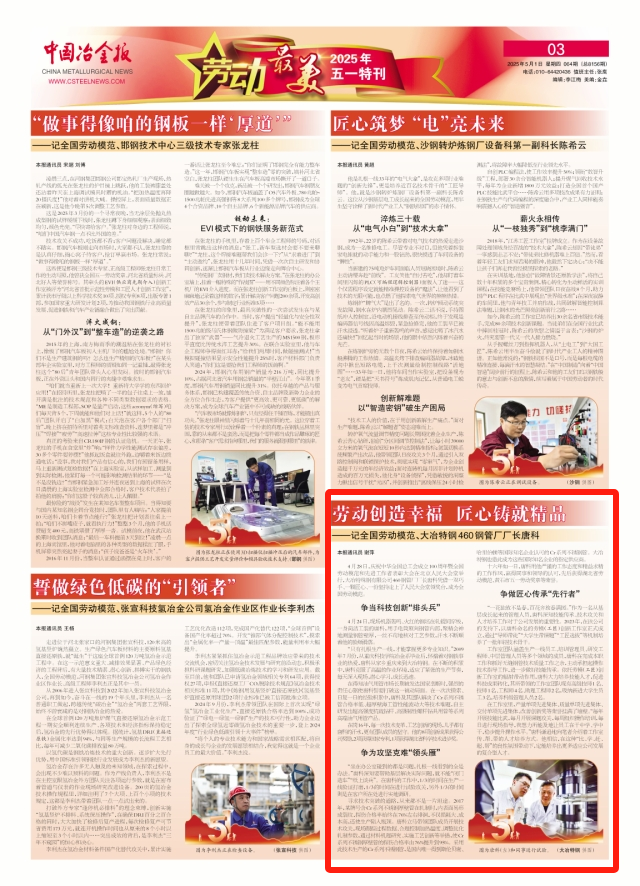 4月28日,慶祝中華全國總工會成立100周年暨全國勞動模范和先進工作者表彰大會在北京人民大會堂舉行,大冶特殊鋼有限公司460鋼管廠廠長唐科憑借一雙巧手、一顆匠心、一份堅持走上了人民大會堂領獎臺,成為全國勞動模范。