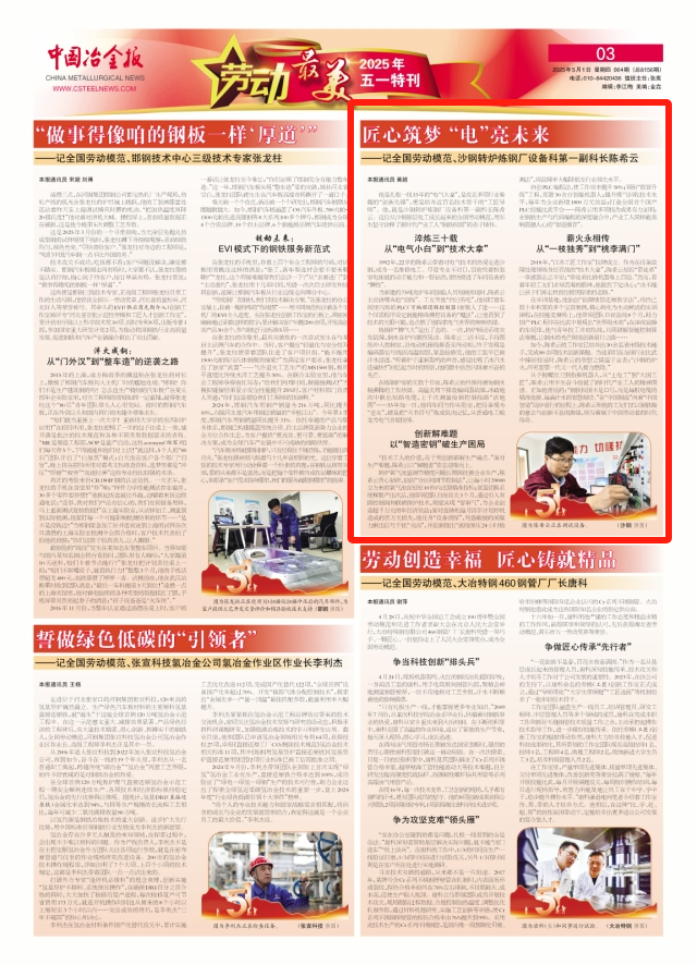 他是扎根一線33年的“電氣大拿”,是攻克多項行業難題的“創新先鋒”,更是培養近百名技術骨干的“工匠導師”。他,就是沙鋼轉爐煉鋼廠設備科第一副科長陳希云。這位從沙鋼基層電工成長起來的全國勞動模范,用半生堅守詮釋了新時代產業工人“鋼鐵報國”的赤子情懷。
