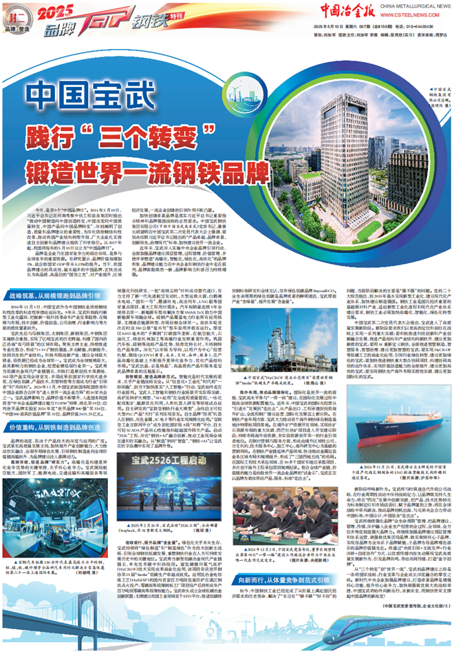 寶武先后與馬鋼集團、太鋼集團、新鋼集團、中鋼集團實施聯(lián)合重組,實現(xiàn)了億噸寶武的歷史跨越,構(gòu)建了國內(nèi)沿江沿海“彎弓搭箭”的區(qū)域布局。聚焦主責(zé)主業(yè),持續(xù)推進(jìn)專業(yè)化整合,形成“1+3+2”鋼鐵強基、多元賦能、向新提升、協(xié)同共生的產(chǎn)業(yè)結(jié)構(gòu)。積極布局戰(zhàn)新產(chǎn)業(yè),建設(shè)全球最大鎂業(yè),鉻資源已經(jīng)成為全球第一。寶武成為全球規(guī)模最大、最具影響力的鋼鐵企業(yè),經(jīng)營業(yè)績穩(wěn)居行業(yè)第一。寶武勇當(dāng)?shù)吞家苯瓞F(xiàn)代產(chǎn)業(yè)鏈鏈長,積極打造原創(chuàng)技術(shù)策源地,102項產(chǎn)品實現(xiàn)全球首發(fā),多項成果獲國家科學(xué)技術(shù)進(jìn)步獎,在綠色低碳、產(chǎn)品技術(shù)、數(shù)智轉(zhuǎn)型等方面成為行業(yè)“引領(lǐng)者”和“風(fēng)向標(biāo)”。2024年11月,中國寶武被國務(wù)院國資委和中國企業(yè)聯(lián)合會評為“進(jìn)入世界一流企業(yè)方陣”的10家央企之一。寶武品牌影響力、品牌價值不斷攀升,入選國務(wù)院國資委“中央企業(yè)品牌建設(shè)能力TOP30”榜單,排名第19位;位列世界品牌實驗室2024年度“世界品牌500強”第334位,“中國500最具價值品牌”第33位,品牌價值2415.25億元。