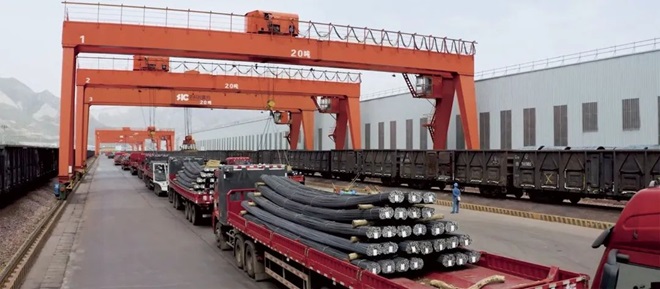 圖為陜鋼集團生產的“禹龍”牌鋼材正在通過鐵運專線運往全國各地。 (靳光輝 攝)