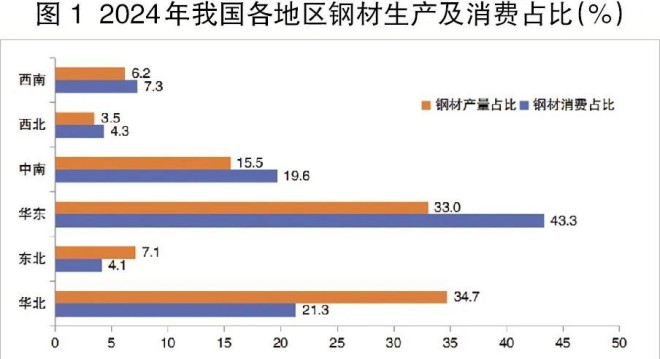 目前,我國存在區域鋼材供需錯配現象。比較突出的是,華北、東北地區鋼材產量大于消費,而華東、中南等地區鋼材產量小于消費。2024年,我國鋼材產量最大的華北地區全國占比達34.7%,而鋼材消費僅占21.3%;東北地區鋼材產量全國占比7.1%,而鋼材消費占比僅4.1%;華北和東北為全國唯二的鋼材凈流出地區,而華東、中南、西南和西北地區均為鋼材凈流入地區,導致我國“北鋼南運”局面的形成。(見圖1)