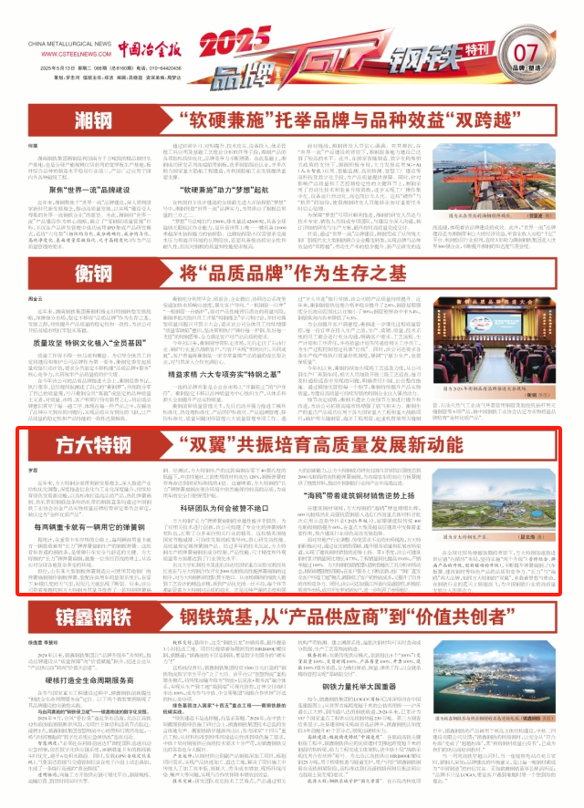 在全球化貿(mào)易摩擦加劇的背景下,方大特鋼加速推進(jìn)供應(yīng)鏈“內(nèi)循環(huán)”布局,堅(jiān)持實(shí)施“兩個(gè)升級(jí)”(普特結(jié)合、彈扁產(chǎn)品的升級(jí),創(chuàng)新驅(qū)動(dòng)的升級(jí)),不斷提升彈簧扁鋼、汽車板簧、建筑鋼材等特色產(chǎn)品的品質(zhì)和競(jìng)爭力。“長力”與“海鷗”兩大品牌,如同方大特鋼的“雙翼”,承載著夢(mèng)想與使命,在鋼鐵行業(yè)的藍(lán)天上展翅高飛,為中國鋼鐵行業(yè)的高質(zhì)量發(fā)展注入澎湃動(dòng)力。(羅霞)