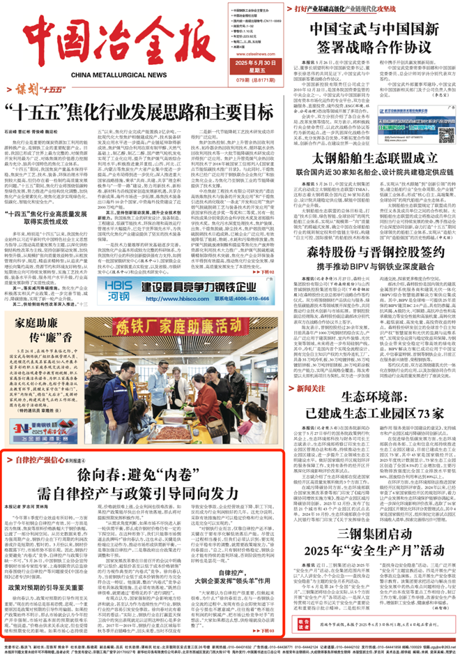 “今年第1季度行業效益有所好轉,一方面是由于今年初鋼企自律控產有效,另一方面是因為焦煤、焦炭等原料價格跌幅大于鋼價跌幅,讓渡了一部分利潤空間。從歷史數據來看,作為強周期產業,鋼鐵行業在下行周期的利潤改善或許是短期的、暫時的。3月份以來,鋼材價格震蕩下行,市場形勢不容樂觀。因此,鋼鐵行業要避免‘內卷式’競爭,自律控產與政策引導缺一不可。”5月26日,中國鋼鐵工業協會宣傳委鋼材市場專家組專家、上海鋼聯資訊總監徐向春圍繞行業自律控產等問題接受《中國冶金報》記者專訪時強調。