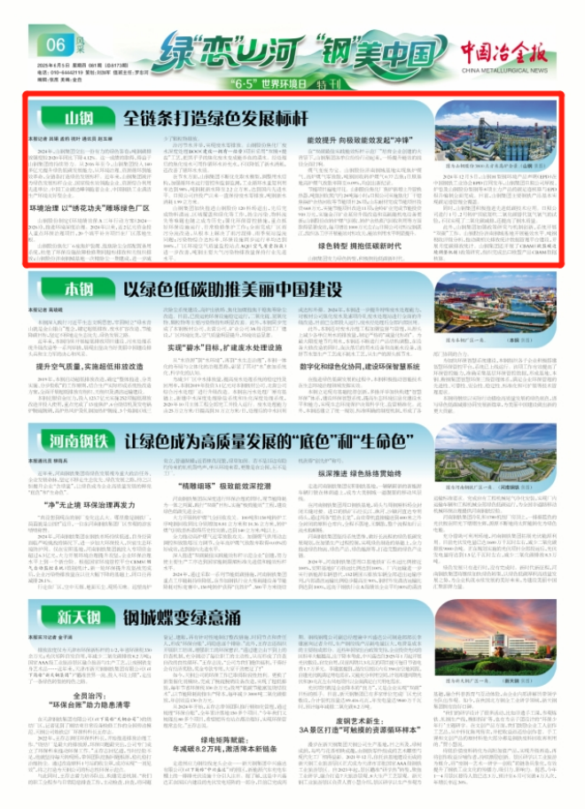 2024年,山鋼集團(tuán)交出一份有力的綠色答卷:噸鋼碳排放強(qiáng)度較2020年同比下降4.12%。這一成績的取得,得益于山鋼集團(tuán)的持續(xù)努力。從2016年至今,山鋼集團(tuán)投入140多億元提升綠色低碳發(fā)展能力,從環(huán)境治理、資源循環(huán)到能效革命,全鏈條打造綠色發(fā)展標(biāo)桿。近年來,山鋼集團(tuán)被評為綠色發(fā)展標(biāo)桿企業(yè)、國家級水效領(lǐng)跑企業(yè)、資源綜合利用先進(jìn)單位、中國工業(yè)碳達(dá)峰領(lǐng)跑者企業(yè)、中國鋼鐵工業(yè)清潔生產(chǎn)環(huán)境友好型企業(yè)。