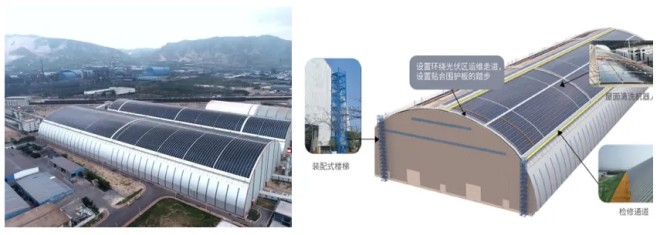 ▲圖為陜鋼龍鋼新建料場項(xiàng)目。(左為施工完成實(shí)拍圖,右為運(yùn)維設(shè)施示意圖)