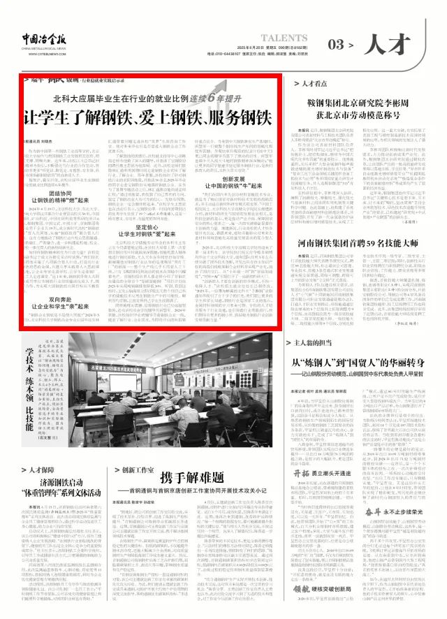 2024年4月19日,北京科技大學、東北大學、中南大學倡議并聯合行業背景高校共50所,中國鋼研、礦冶科技、中國有研科技等科研院所共6所,鞍鋼集團、中國寶武、中國五礦、首鋼集團等行業骨干企業共19所,成立新時代高校“鋼筋鐵骨”育人共同體,實施“鋼筋鐵骨”聯合育人行動。這有力地推動了鋼鐵行業內校企思教融通、科教融匯、產教融合,進一步構建起校地、校企、校校一體化育人的新格局新生態。