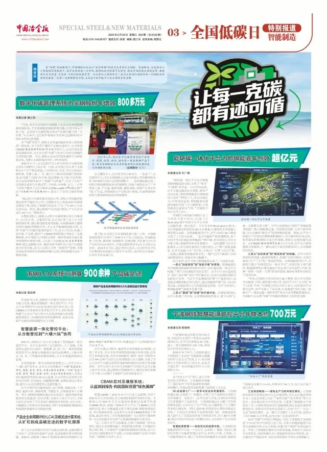 自2023年以來,南鋼充分發揮自身數字化研發能力優勢,建成智慧能源一體化管控平臺、產品全生命周期評價(LCA)及碳足跡計算系統以及CBAM應對及填報系統等數字化平臺,同時探索構建與企業生產運行數字化系統深度融合的智慧碳管理體系,為南鋼加快綠色低碳轉型、促進全流程產業鏈協同降碳提供有力支撐。