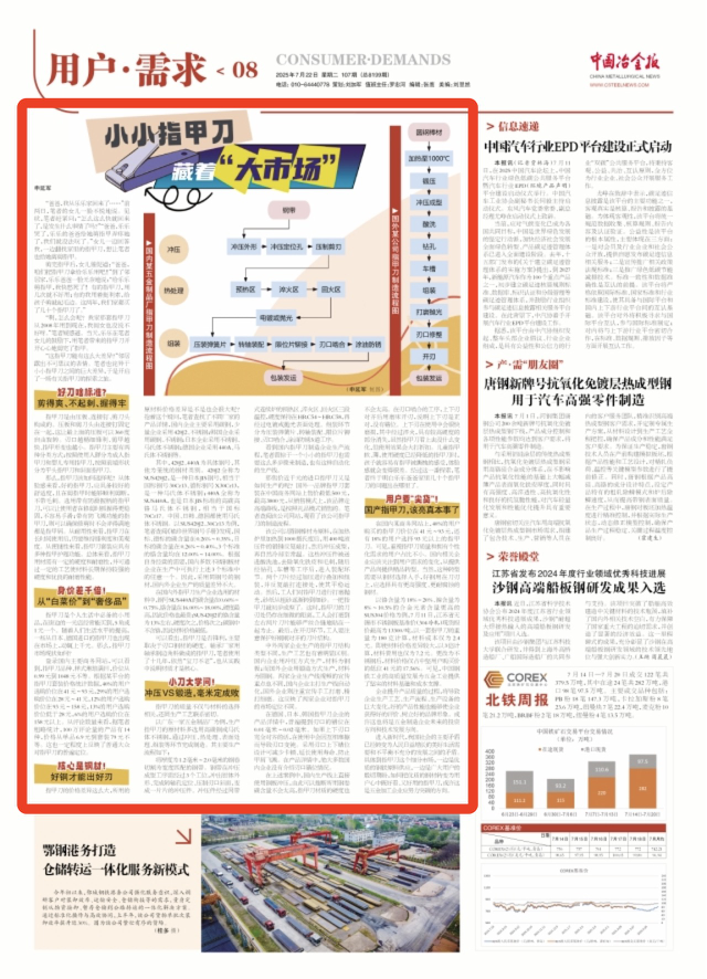 在國內某商務網站上,40%的用戶購買的指甲刀價位在41元~93元,還有18%的用戶選擇93元以上的指甲刀。可見,重視指甲刀質量和擁有個性化需求的用戶占比不小。國內相關企業應該關注到用戶需求的變化,從提供產品向提供精品轉型。當然,這種轉型需要從鋼材選擇入手,好鋼用在刀刃上,應選擇具有更高強度、更耐腐蝕的鋼材。