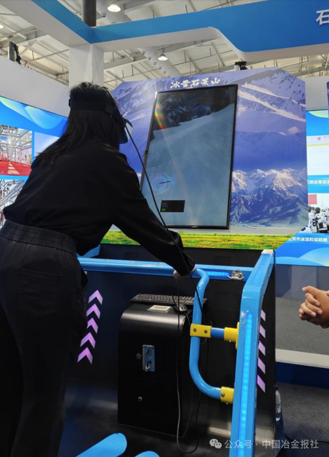 當《中國冶金報》記者戴上VR設備,瞬間被傳送到冰雪賽場:虛擬滑雪板在“波浪道”等高難度雪道上疾馳,失重感與風聲呼嘯而至,驚險的俯沖動作讓記者不禁攥緊體驗器扶手。