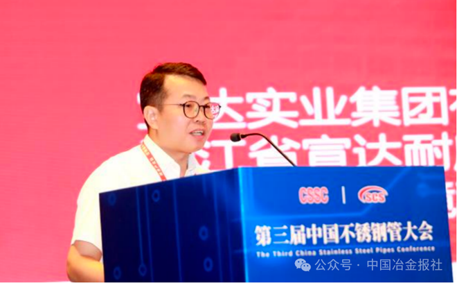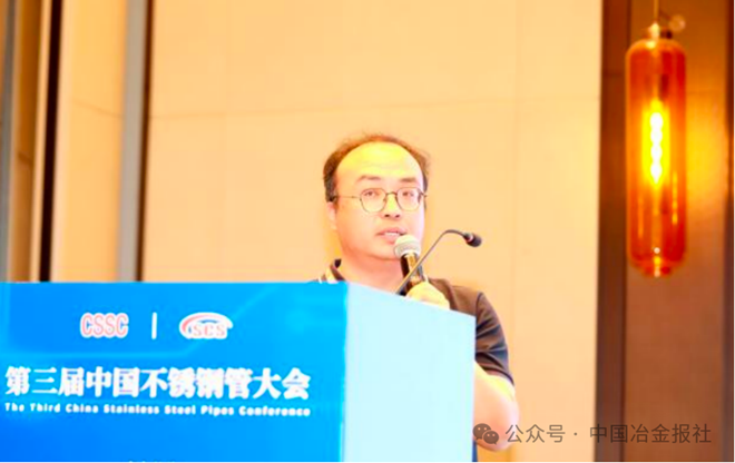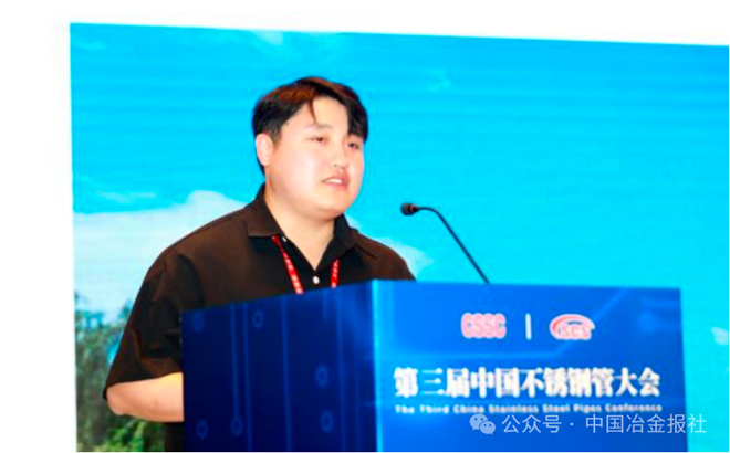 圖為中國寶武太鋼不銹高級工程師、品質部部長王伯文做題為《新能源產(chǎn)業(yè)用鐵鎳基合金管材關鍵技術研究及應用》的主旨報告