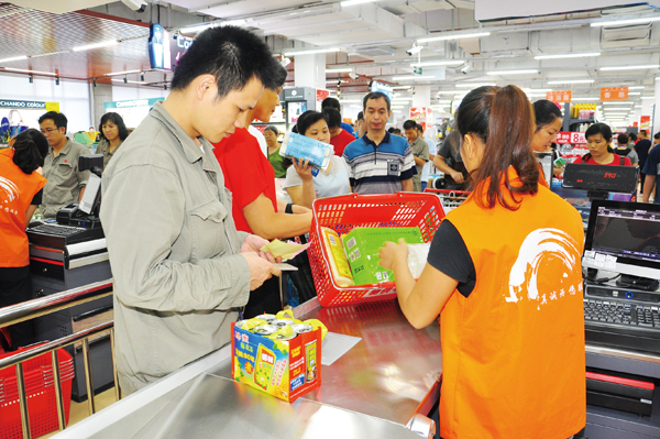 6月10日,經過將近半年規劃改造的柳鋼職工超市以全新的面貌重裝開業。新的超市整合了原紅星農產品超市,銷售平臺更寬廣,購物環境更舒適,試營業期間打折商品近4000件,深受職工歡迎。圖為柳鋼職工在排隊購物。 (記者 覃守超 通訊員 龍妍 攝)