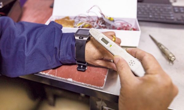 傅署陽發(fā)明的這款電筆智能在哪里?傅署陽給筆者展示了這款“智能有電危險提醒手表”的創(chuàng)新技術特點。他一邊佩戴一邊向筆者介紹說:“這款電筆就像智能手表,戴在手腕上,在感應到有電裝置時,可以通過報警聲音、警示燈光、發(fā)出振動等多種形式提醒作業(yè)人員,觸感十分靈敏。若是非專業(yè)電工人員進入有電區(qū)域,無需直接接觸帶電體,通過振動警示即可知曉。”
