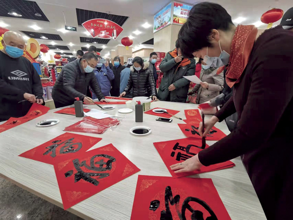 聽著超市廣播里反復(fù)播放的信息,高大爺找到了送春聯(lián)的地方。在超市二樓中心轉(zhuǎn)彎處,四位書法家正圍繞著一張方桌揮毫疾書,為購物群眾書寫著福字和春聯(lián)。一張張寫好的大“福”字和一副副春聯(lián)擺放在貨架及地面上,人們蜂擁而至,熱鬧非凡。