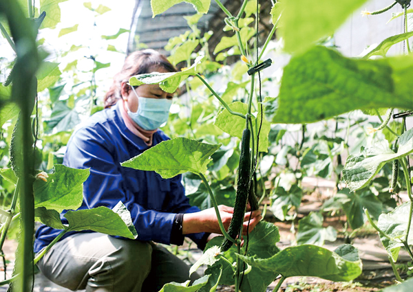 圖為張宣高科集企公司職工正在檢查黃瓜長(zhǎng)勢(shì)。(記者 李巍 攝)