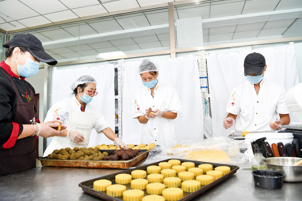 圖為承德釩鈦萬樹園公司營養餐廳員工正在制作月餅。 (劉士富 攝)