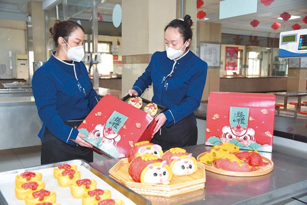 圖為張宣科技行政服務中心職工正在將產品裝進花饃禮盒。 (孫琦 攝)