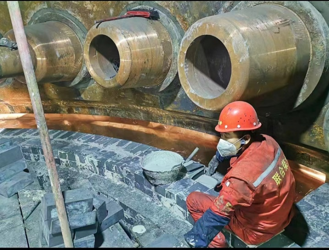 圖為在由聯(lián)合榮大總包的陽春新鋼1#高爐快速大修工程中,施工隊(duì)正在砌筑爐底陶瓷杯。
