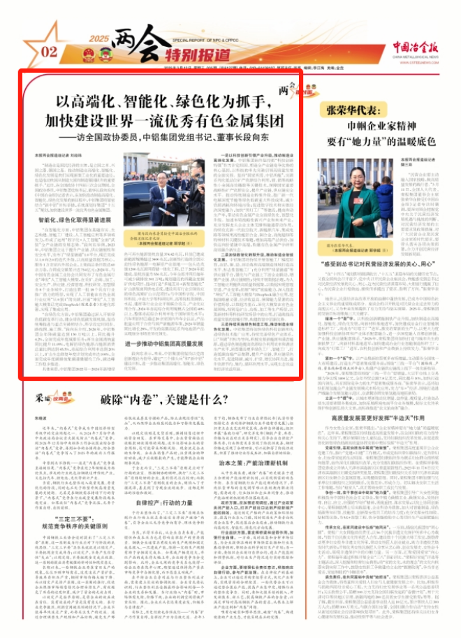 “制造業(yè)是國民經(jīng)濟(jì)的主體,是立國之本、興國之器、強(qiáng)國之基。推動(dòng)制造業(yè)高端化、智能化、綠色化發(fā)展是我們實(shí)現(xiàn)新型工業(yè)化的重要途徑,也是推動(dòng)我國從制造大國向制造強(qiáng)國躍升的重要抓手。”近日,在全國政協(xié)十四屆三次會(huì)議期間,全國政協(xié)委員,中鋁集團(tuán)黨組書記、董事長(zhǎng)段向東向《中國冶金報(bào)》記者表示,在加快推動(dòng)制造高端化、智能化、綠色化發(fā)展的新征程中,中鋁集團(tuán)將緊密結(jié)合“新中鋁”目標(biāo)舉措,系統(tǒng)謀劃好集團(tuán)“十五五”規(guī)劃,加快建設(shè)世界一流優(yōu)秀有色金屬集團(tuán)。