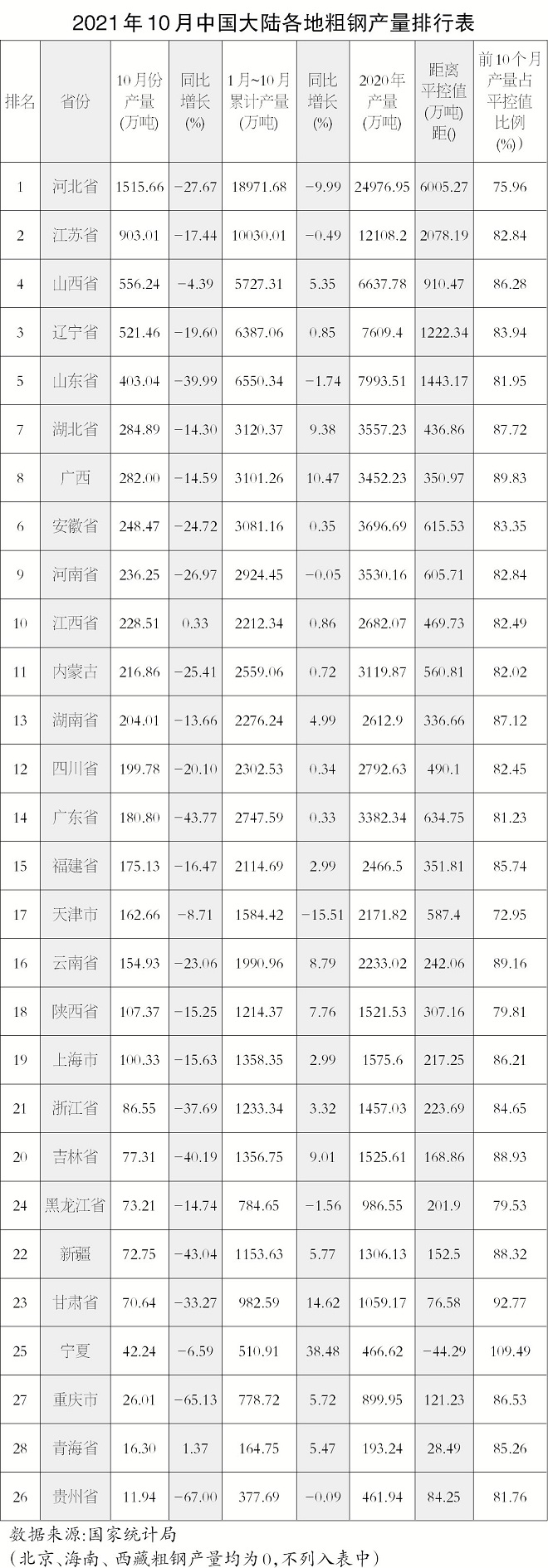 從最新粗鋼產(chǎn)量數(shù)據(jù)來看,寧夏是唯一一個前10個月粗鋼產(chǎn)量超過去年整年粗鋼產(chǎn)量(平控值)的省份,超過近10%;甘肅、廣西、云南、吉林、新疆等地粗鋼壓產(chǎn)任務(wù)相對較重。從前10個月累計粗鋼產(chǎn)量來看,天津同比降幅最大,下降15.51%;其次是河北省,同比降幅為9.99%;同比增幅最大的是寧夏,為38.48%。(詳見表)