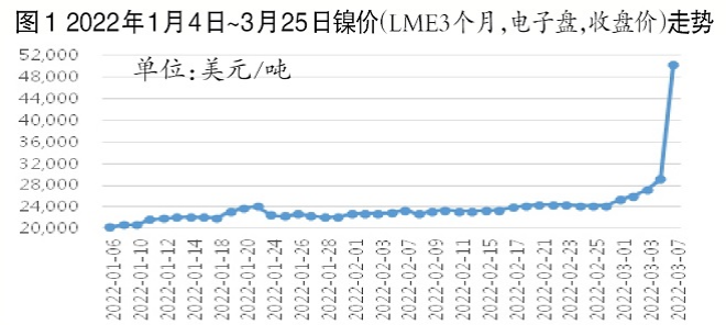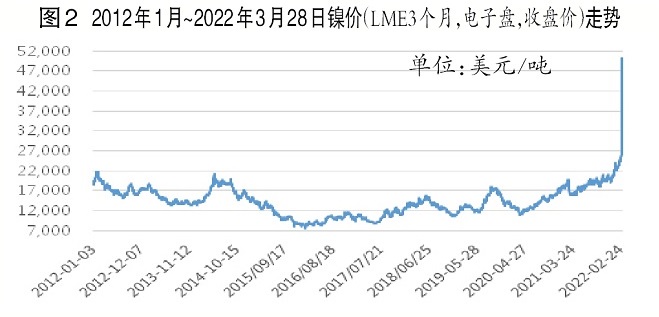 2022年以來,受新能源、局部地緣沖突等因素的刺激,鎳價不斷上攻,截至2022年3月7日,鎳價(LME3個月,電子盤,收盤價)達到50300美元/噸,創歷史新高,較2022年1月4日的21040美元/噸上漲了139%。(見圖1)